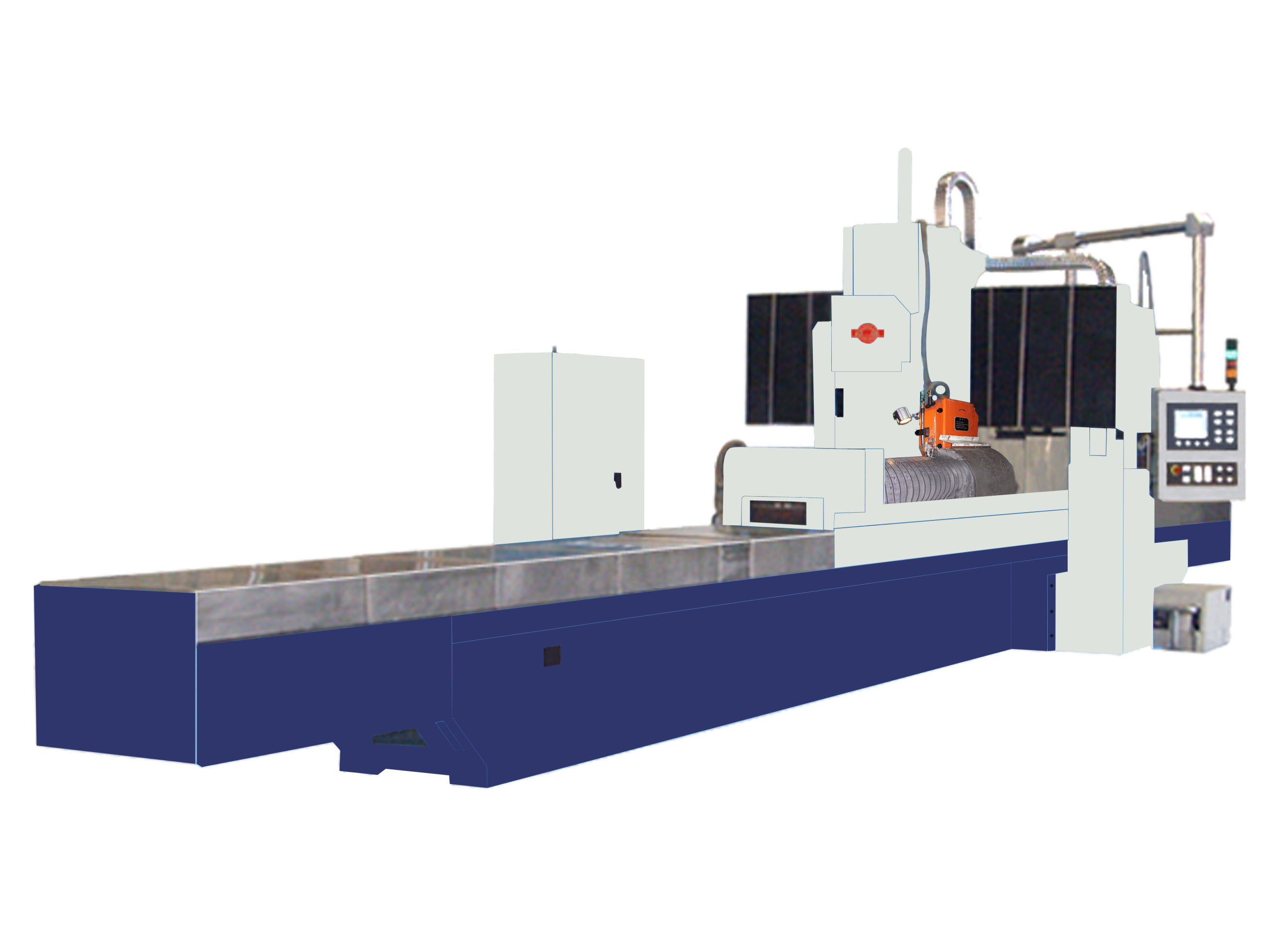 1. 本機(jī)床采用固定橫梁封閉框架龍門結(jié)構(gòu)。機(jī)床具有X軸(縱向移動(dòng))、Y軸(橫向移動(dòng))、Z軸(垂直移動(dòng))A軸(分度頭旋轉(zhuǎn))、Z1軸(砂輪修整器垂直移動(dòng))五個(gè)數(shù)控坐標(biāo)軸,利用成型砂輪表面磨削瓦楞輥的齒形,機(jī)床同時(shí)采用X軸、Z軸兩軸聯(lián)動(dòng)的方式進(jìn)行磨削使機(jī)床具有曲線磨削功能,適用于瓦楞輥全長上的中凸磨削要求。